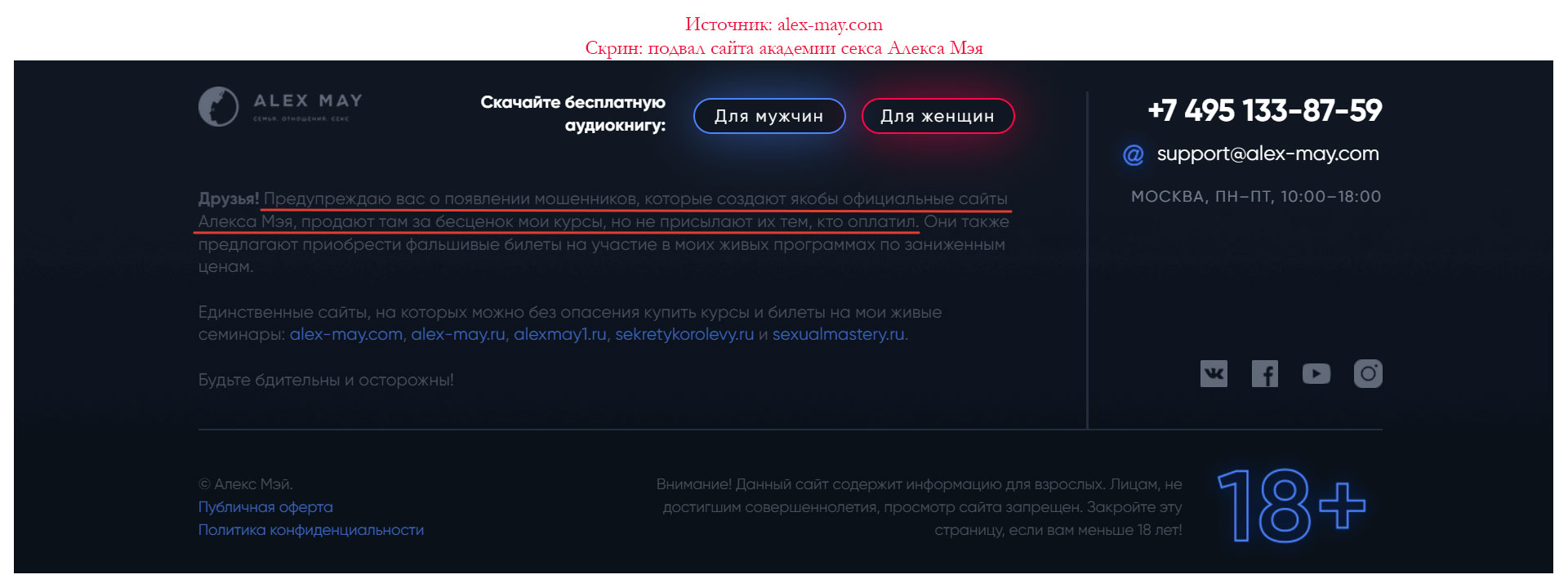 Важная вещь: если вбить в поисковую строку Яндекса или Гугла фразу "Алекс Мэй сайт", выскочит ряд поддельных ресурсов, которые никакого отношения к данному эксперту не имеют. Я сама их проверяла, да и на официальном сайте академии об этом тоже предупреждают. 👇