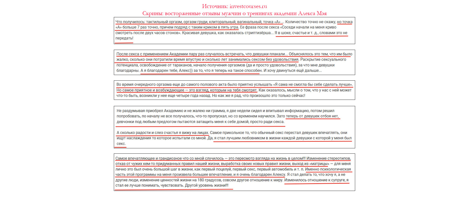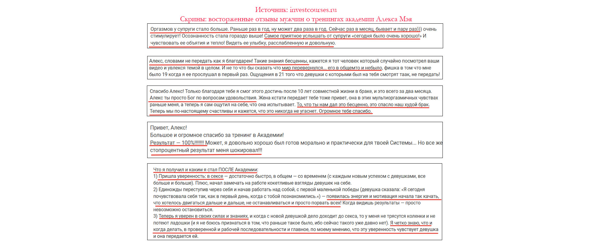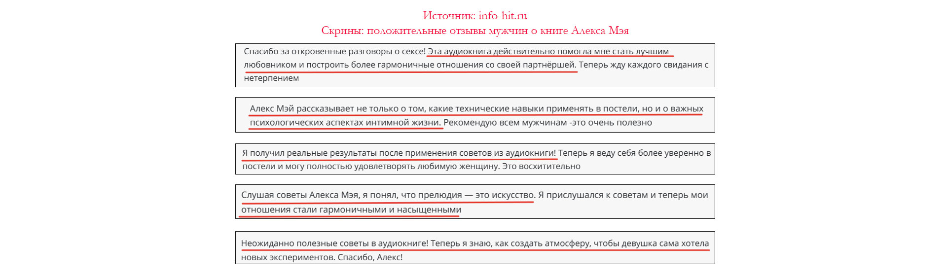 Ничего утверждать не буду, но вы же сами видите — результаты анализа сходятся в том, что: Алекс Мэй — реальный специалист по мнению большинства. Его видеокурсы и правда работают и подходят для любых возрастов. Это подтверждают многочисленные “овации” восторженных мужчин, которые прошли обучение и получили изменения: от уверенности в постели до спасения брака.