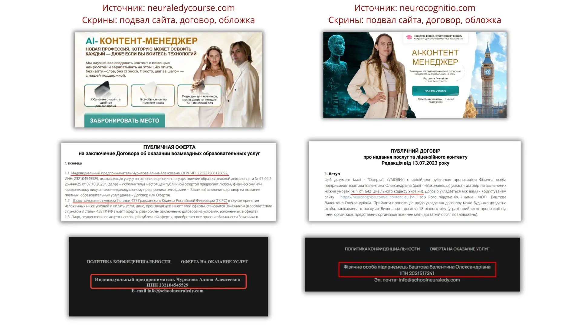 "AI-контент Менеджер" (где изображен Сергей Григорьев-Апполонов) — договор РФ, а где Алина одна — нет